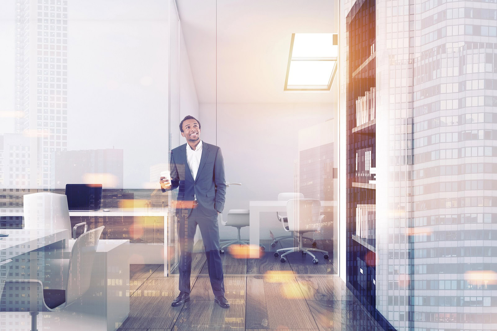 גבר בחליפה מחזיק כוס, עומד ומחייך במשרד מודרני עם חלונות גדולים, שולחנות ומדפים, ומבנים עירוניים נראים מבחוץ.
