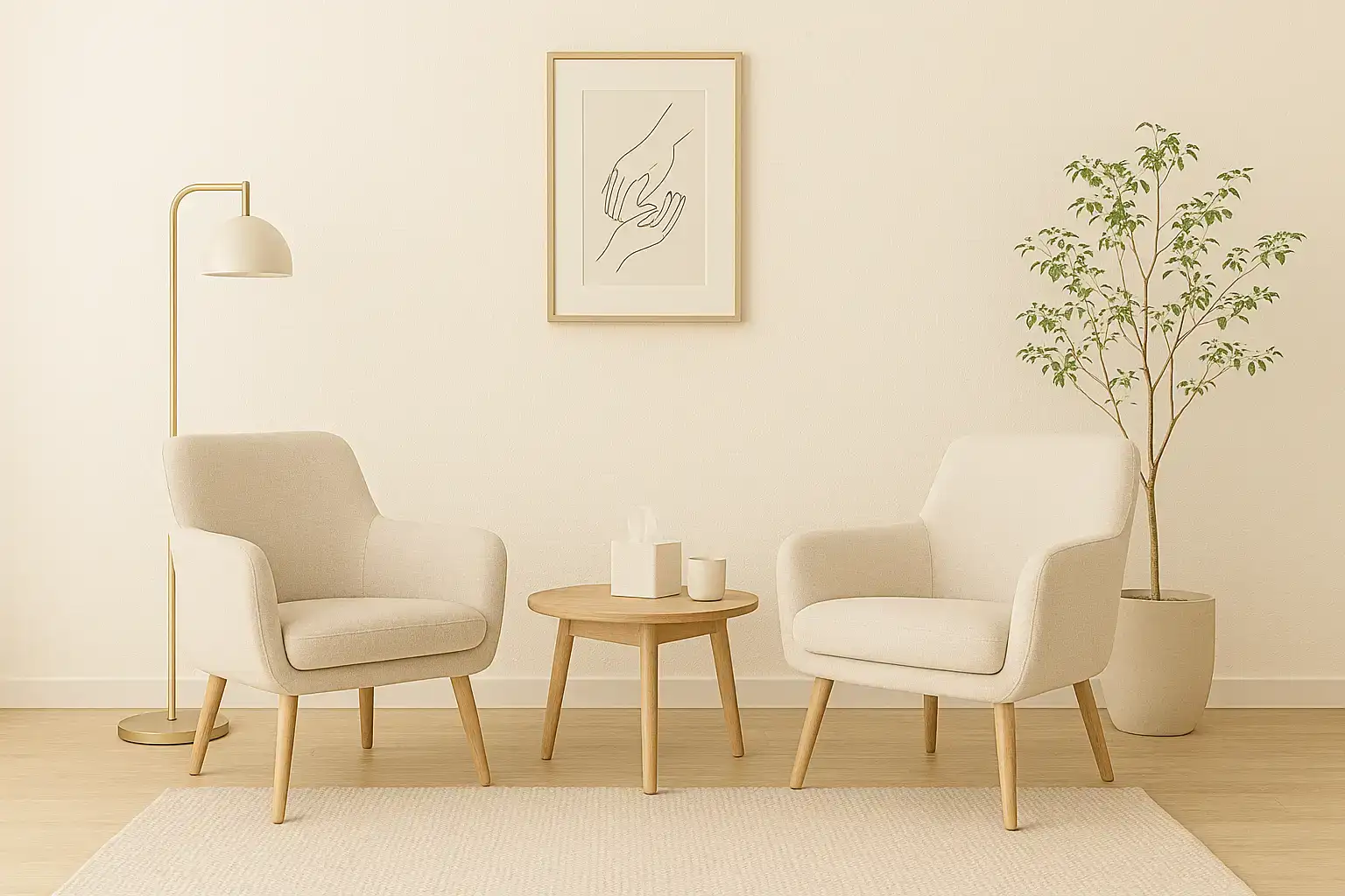 סלון מינימליסטי עם שני כורסאות בצבע שמנת, שולחן עץ עגול ביניהן, מנורת רצפה, עציץ וציור ממוסגר על קיר בהיר. החלל מואר ומעוצב בגוונים ניטרליים.